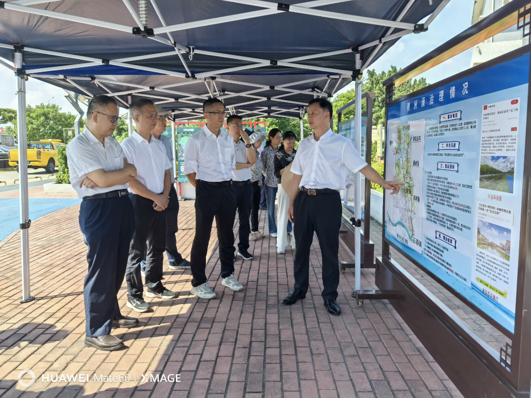 调研组一行现场听取番禺区水环境治理三年攻坚行动情况汇报,徒步查看雁洲涌综合整治效果、中部净水厂二期污水系统建设运行情况。