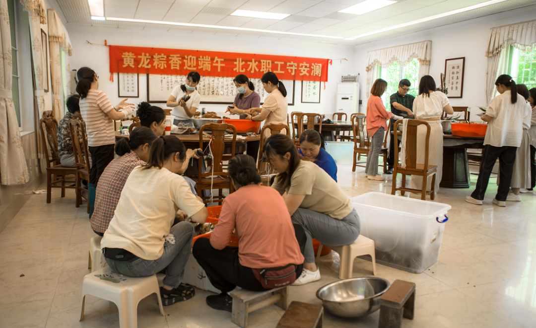 活动当天,干部职工们分组协作,从折叶、填料到扎绳,一只只粽子陆续制作完成,手艺显得相当娴熟。经过大约4小时的慢火熬制,粽香缭绕,溢满黄龙。展开粽叶包裹的鲜香咸糯,轻尝流传千年的传统习俗,感受和谐向上的单位氛围,体现“北水”家庭的凝聚力。